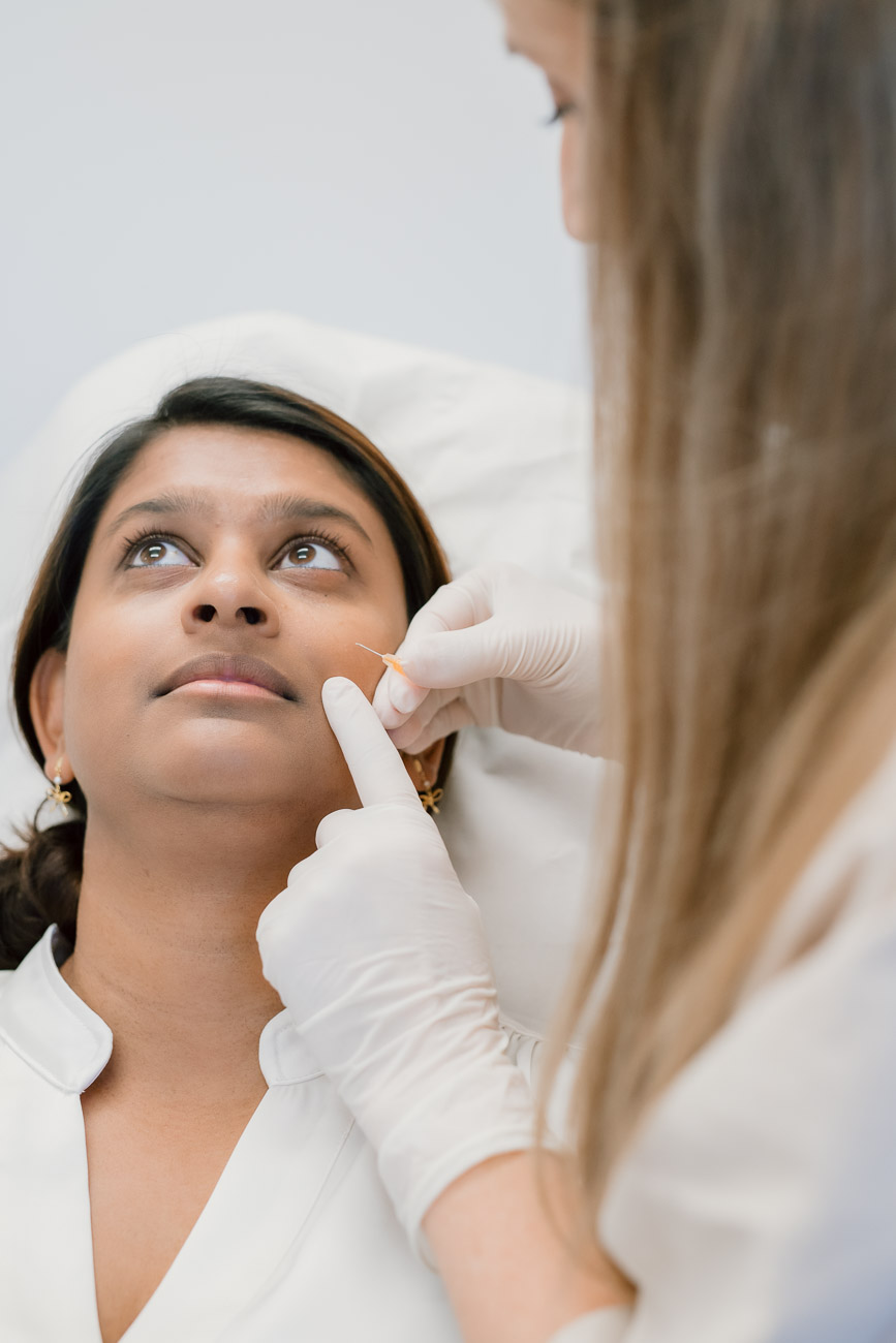 Behandlingen: På behandlingsdagen markeres området, og filleren lægges med en tynd nål eller en stump kanyle (cannula) – alt efter hvilket område vi behandler. Begge teknikker er skånsomme og giver præcise, naturlige resultater.